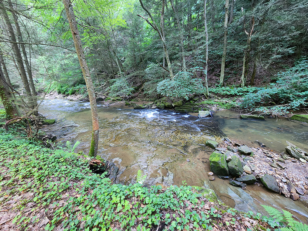 The park features a picnic area, fishing areas, and trail access along the creek.